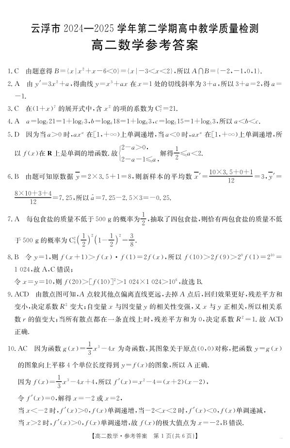 高二数学答案--广东省云浮市2024-2025学年高二下学期高中教学质量检测