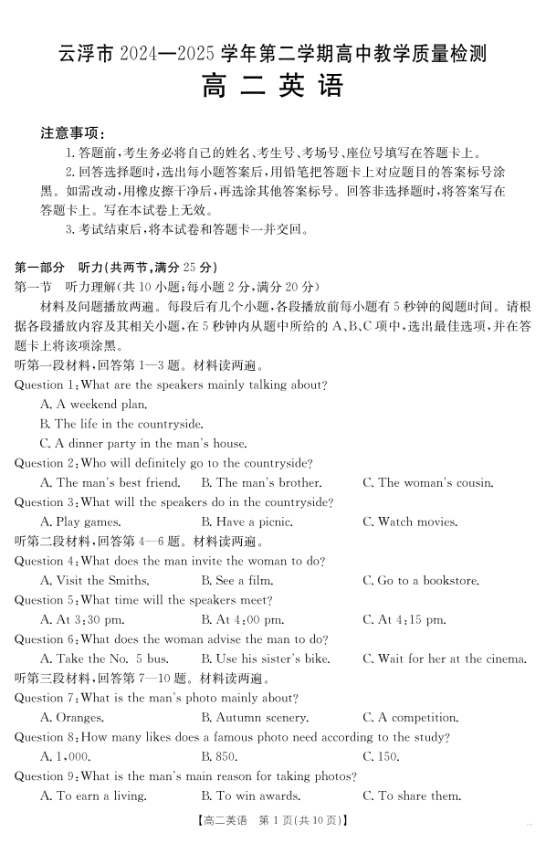高二英语--广东省云浮市2024-2025学年高二下学期高中教学质量检测