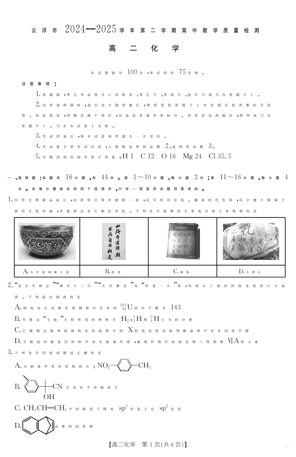 高二化学--广东省云浮市2024-2025学年高二下学期高中教学质量检测