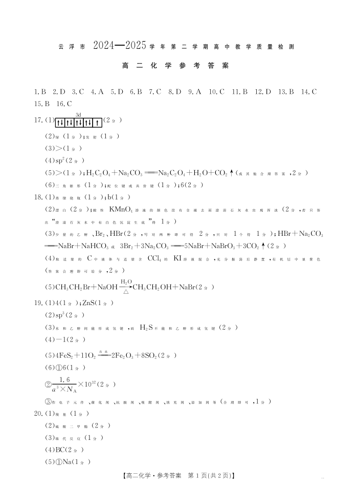 高二化学答案--广东省云浮市2024-2025学年高二下学期高中教学质量检测