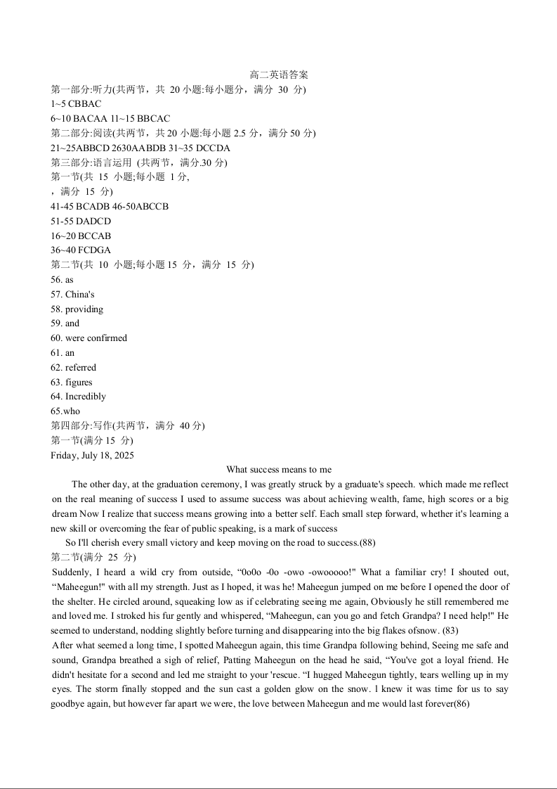 高二英语答案--辽宁省大连市2024-2025学年高二下学期期末考试