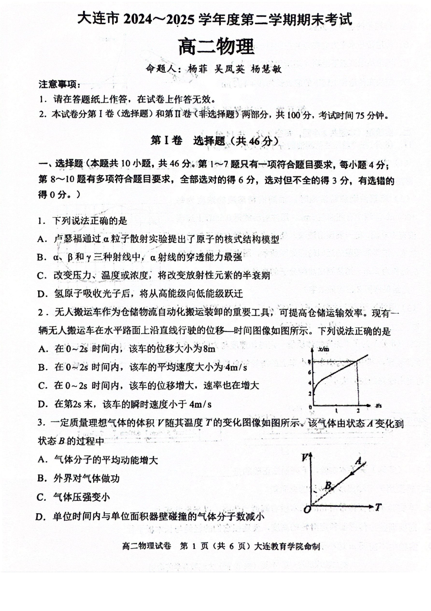 高二物理+答案--辽宁省大连市2024-2025学年高二下学期期末考试