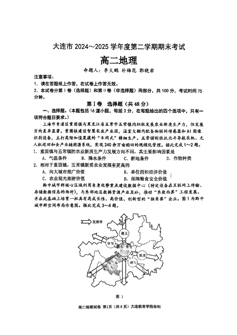 高二地理+答案--辽宁省大连市2024-2025学年高二下学期期末考试