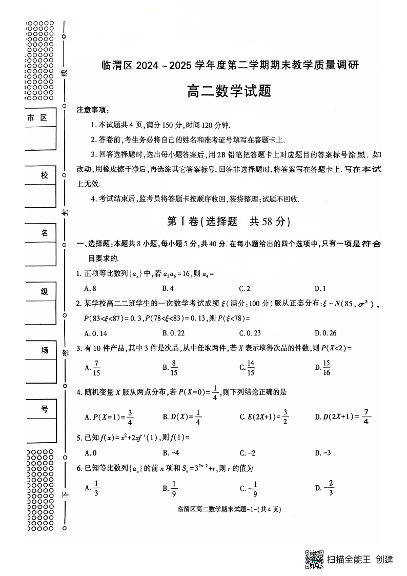 高二数学+答案--陕西省渭南市临渭区2024-2025学年高二下学期期末教学质量调研