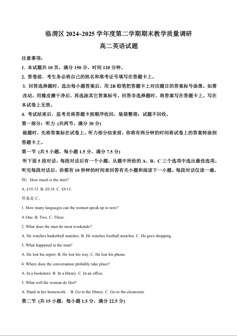 高二英语+答案--陕西省渭南市临渭区2024-2025学年高二下学期期末教学质量调研