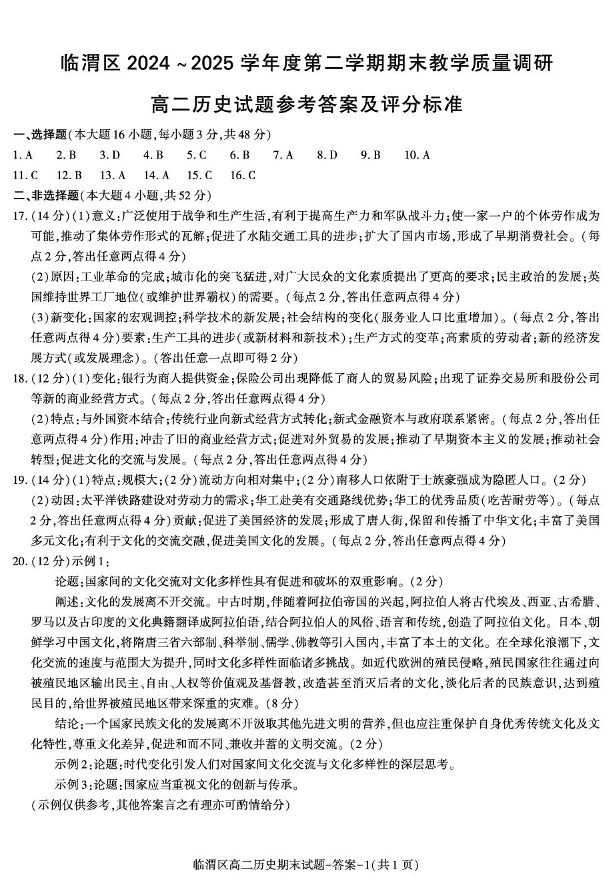 高二历史答案--陕西省渭南市临渭区2024-2025学年高二下学期期末教学质量调研
