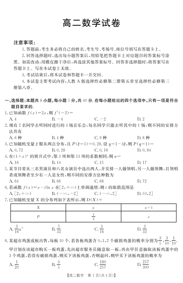高二数学--新疆2024-2025学年高二下学期7月联考试卷