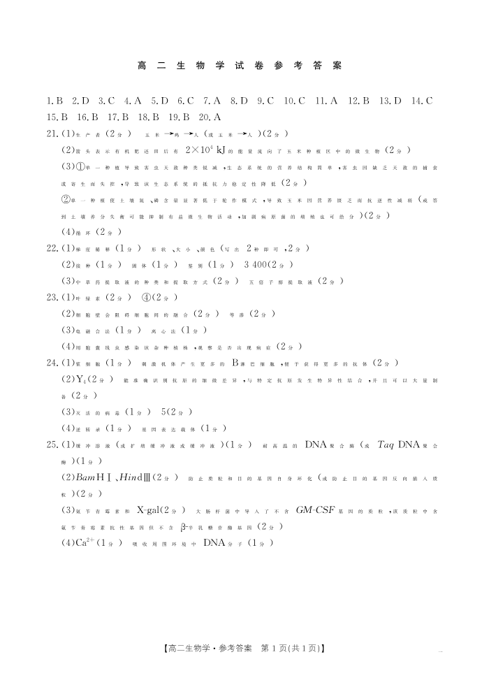 高二生物答案--新疆2024-2025学年高二下学期7月联考试卷
