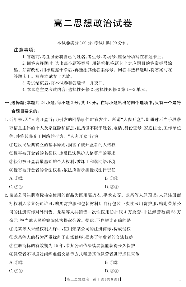高二政治--新疆2024-2025学年高二下学期7月联考试卷