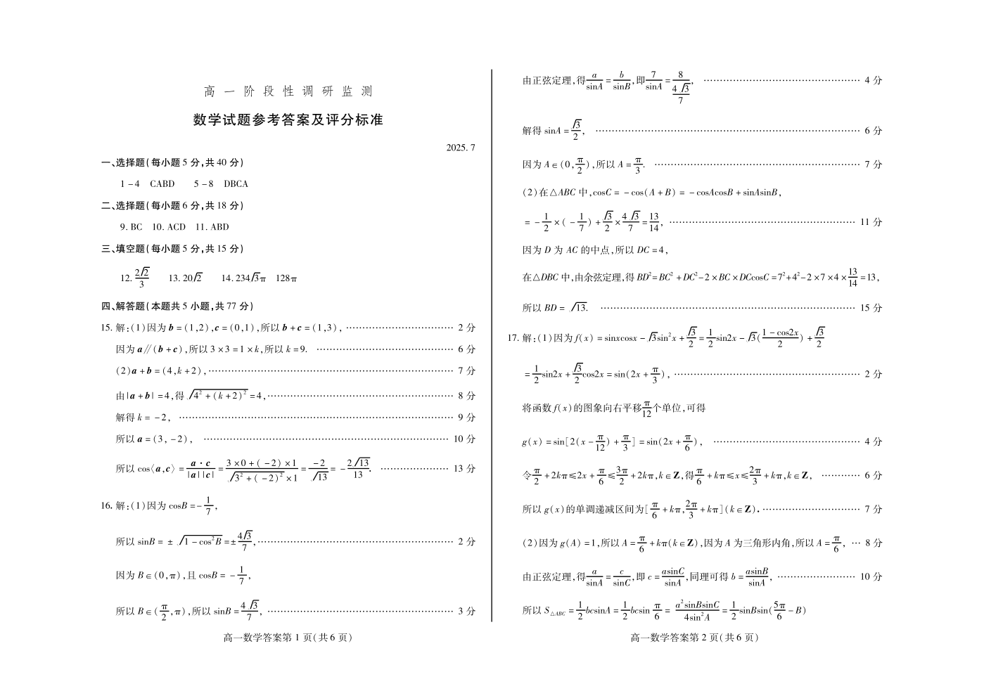高一数学答案--山东省潍坊市2025.7期末阶段性监测