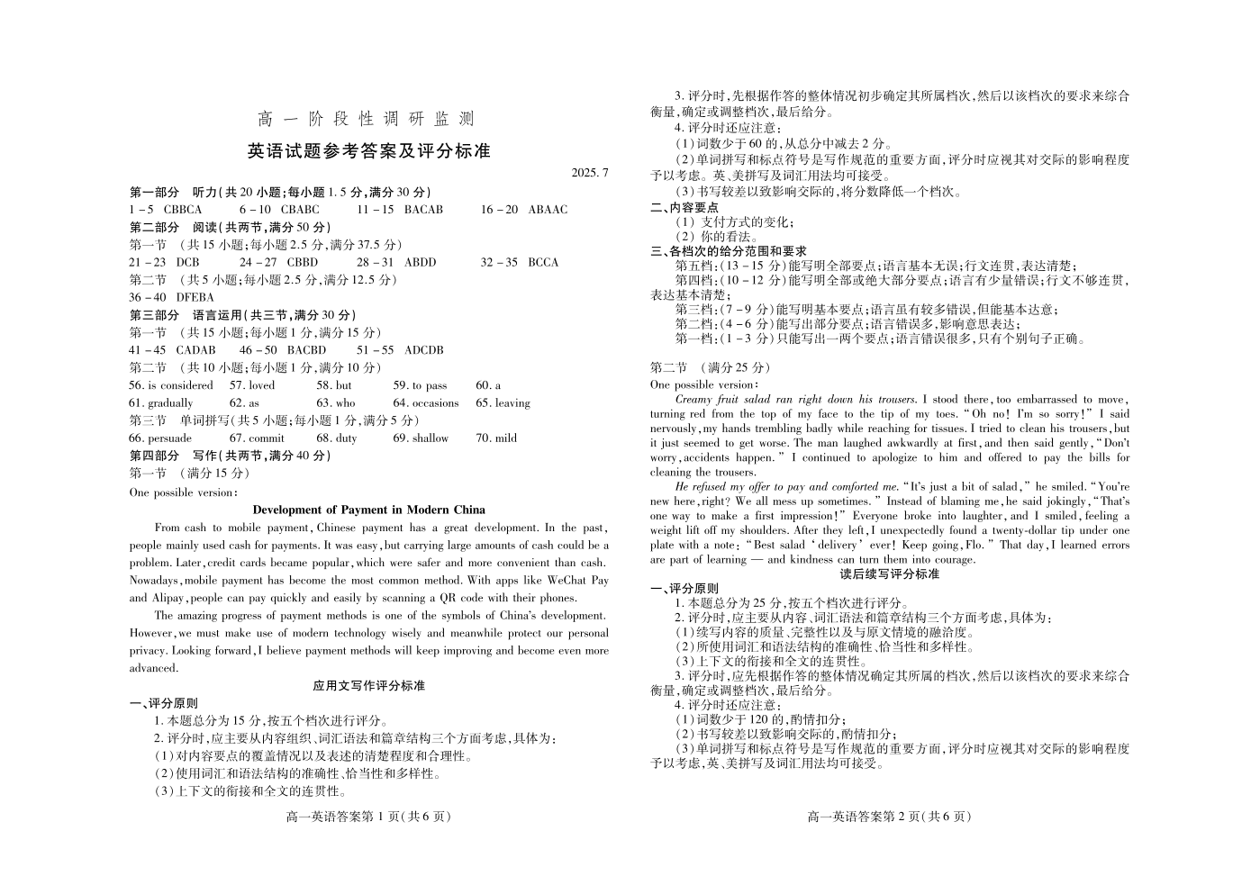 高一英语答案--山东省潍坊市2025.7期末阶段性监测