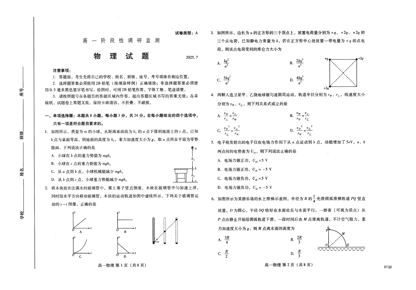 高一物理 --山东省潍坊市2025.7期末阶段性监测