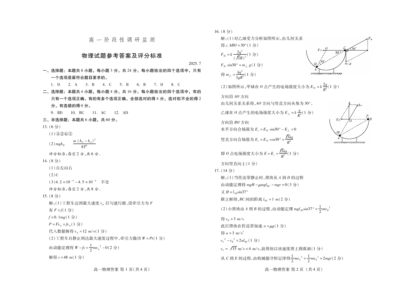 高一物理答案--山东省潍坊市2025.7期末阶段性监测