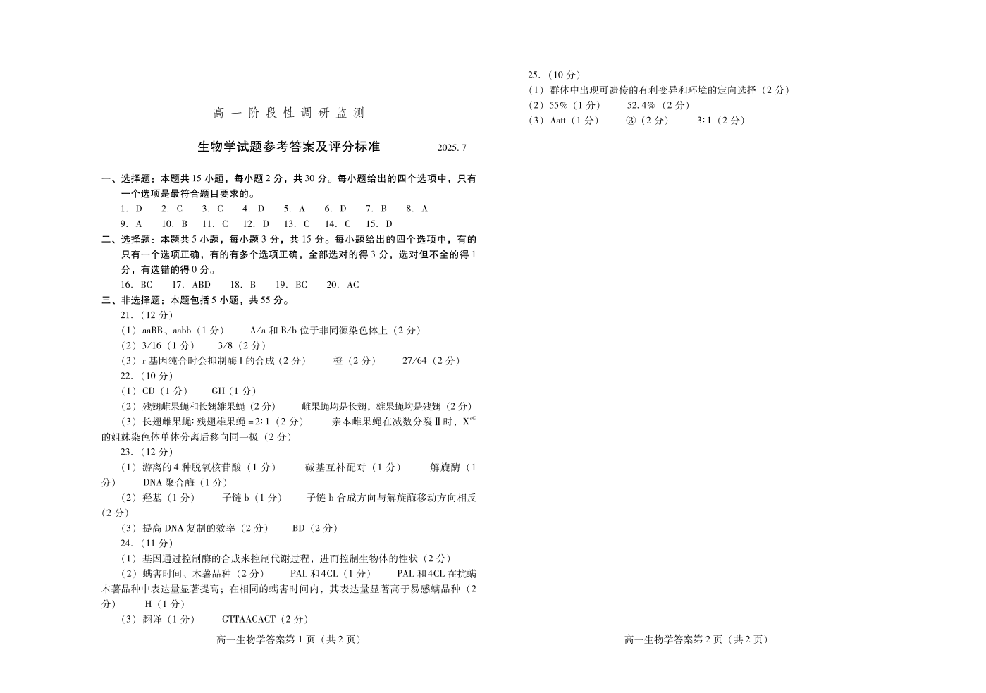 高一生物答案--山东省潍坊市2025.7期末阶段性监测