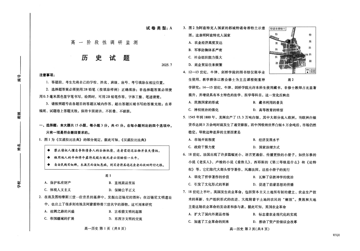 高一历史 --山东省潍坊市2025.7期末阶段性监测