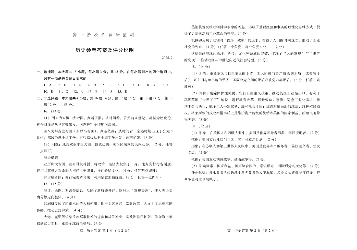 高一历史答案--山东省潍坊市2025.7期末阶段性监测