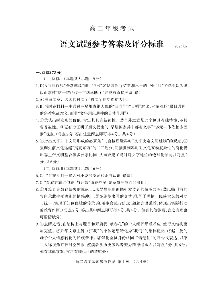 高二语文答案--山东省泰安市2025.7期末考试