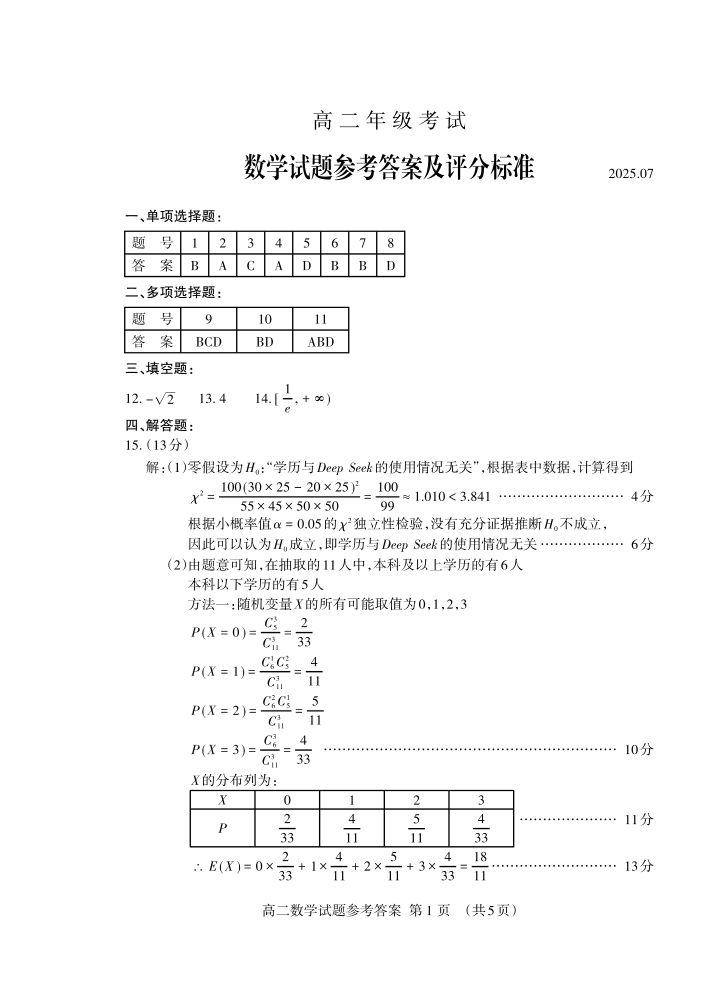 高二数学答案--山东省泰安市2025.7期末考试