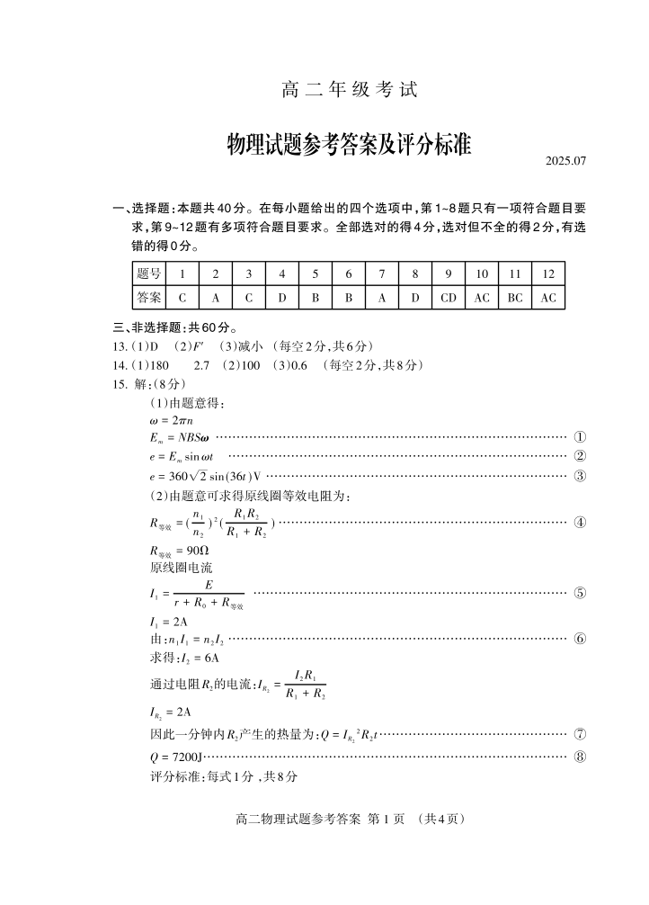 高二物理答案--山东省泰安市2025.7期末考试