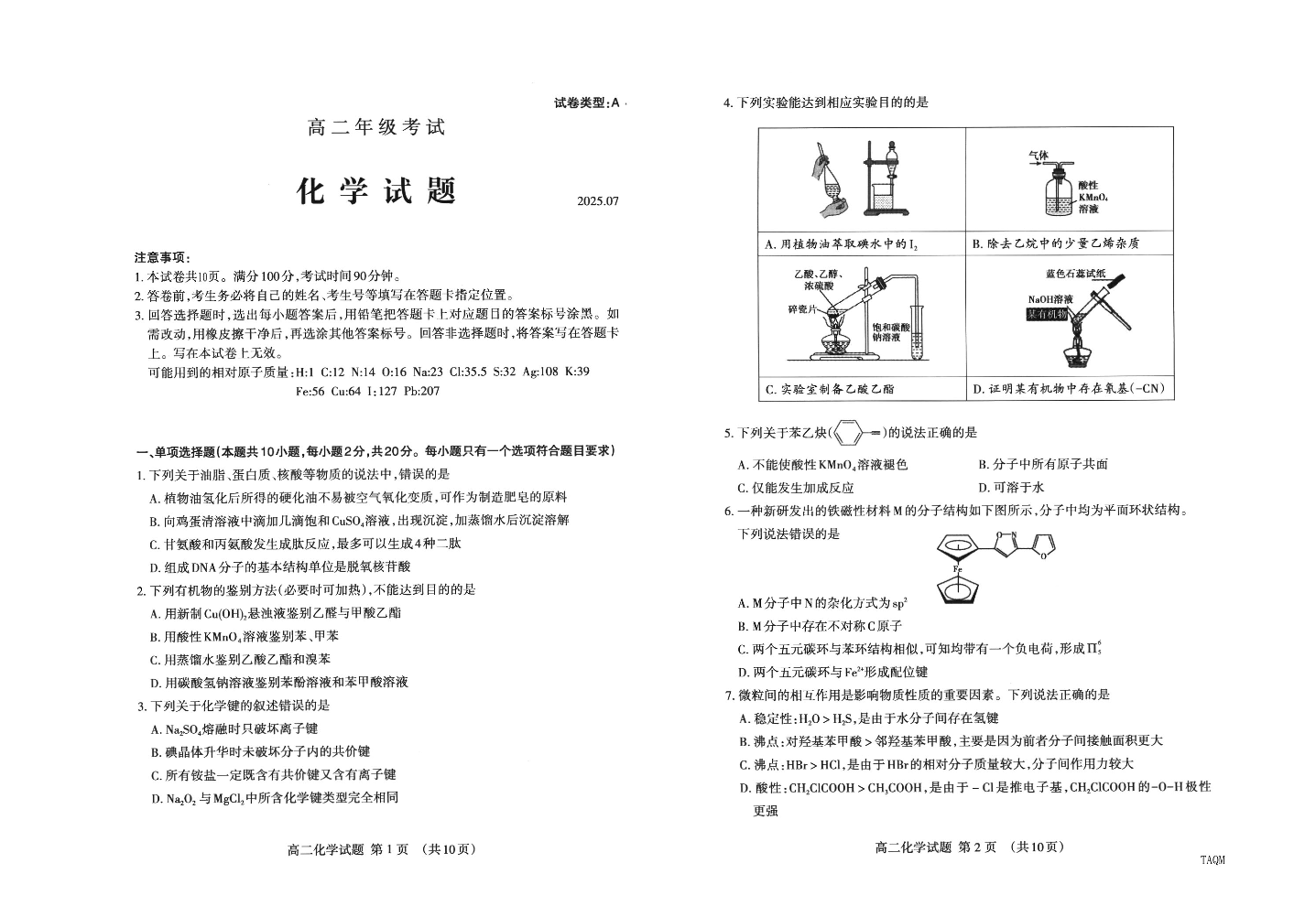 高二化学--山东省泰安市2025.7期末考试