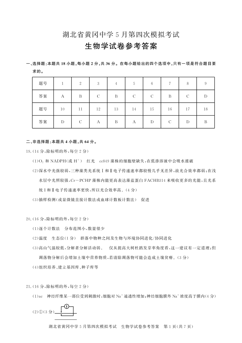 湖北省黄冈中学2024届高三5月四模生物答案