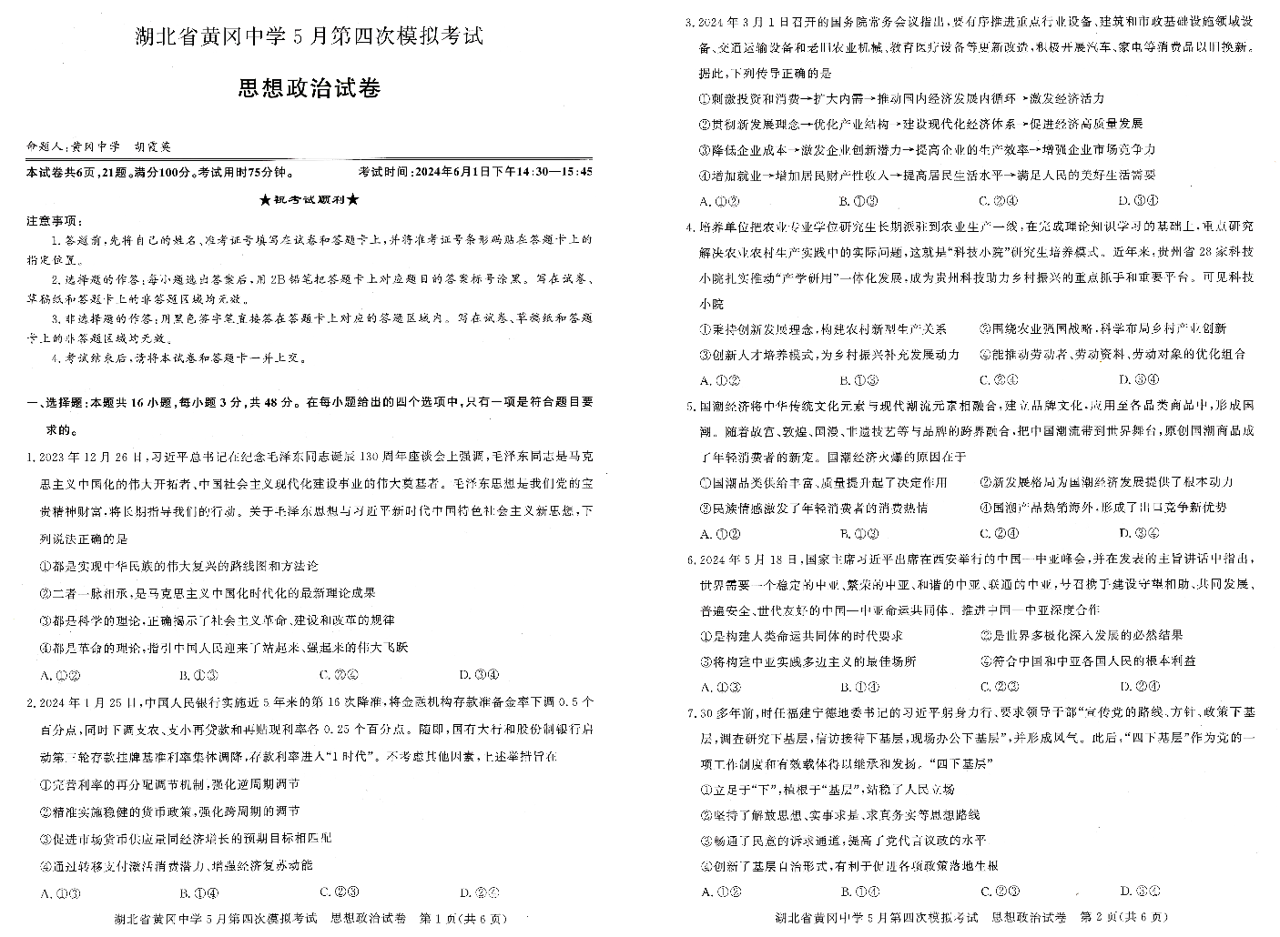 湖北省黄冈中学2024届高三5月四模政治
