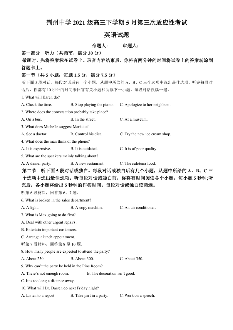 湖北省荆州中学2024届高三第三次适应考英语+答案