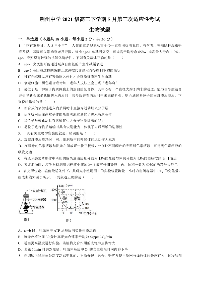 湖北省荆州中学2024届高三第三次适应考生物+答案