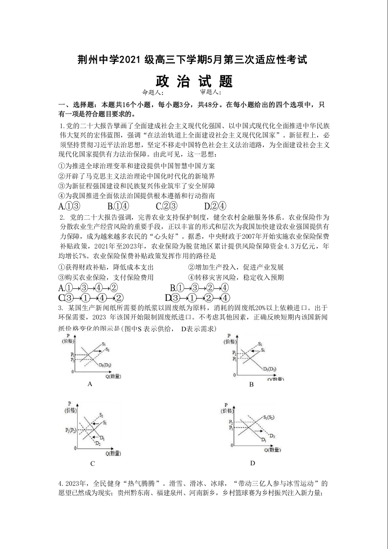 湖北省荆州中学2024届高三第三次适应考政治+答案