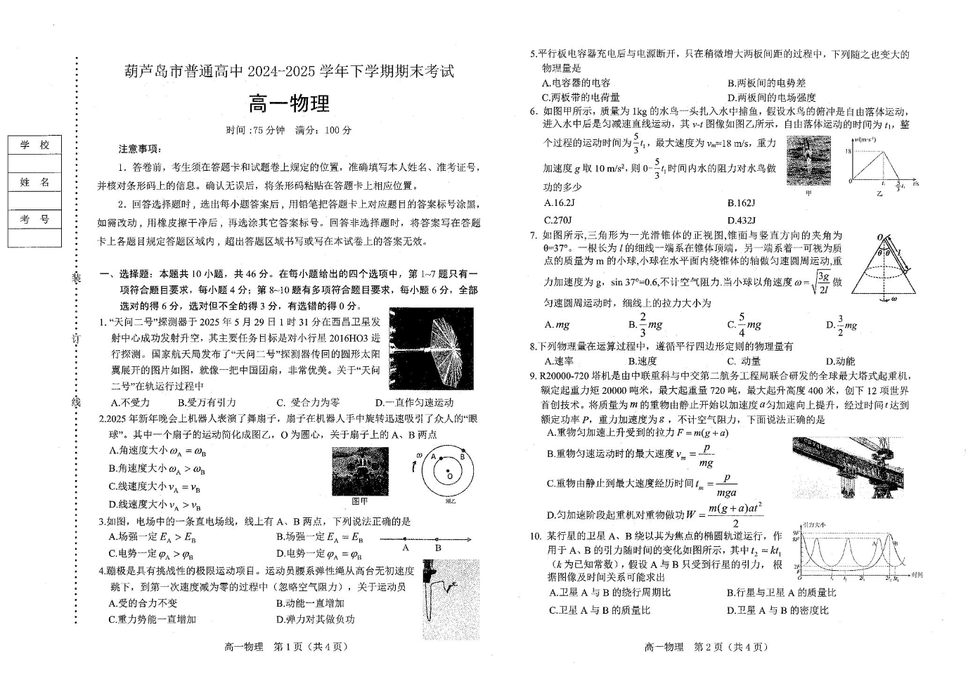 高一物理+答案--辽宁省葫芦岛市普通高中2024-2025学年高一下学期期末考试