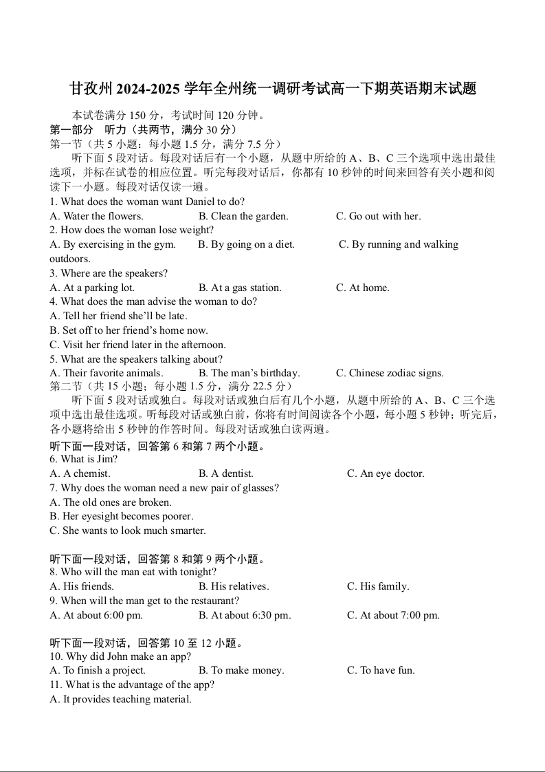 高一英语+答案--四川省甘孜藏族自治州2024-2025学年高一下学期7月期末全州统一调研考试
