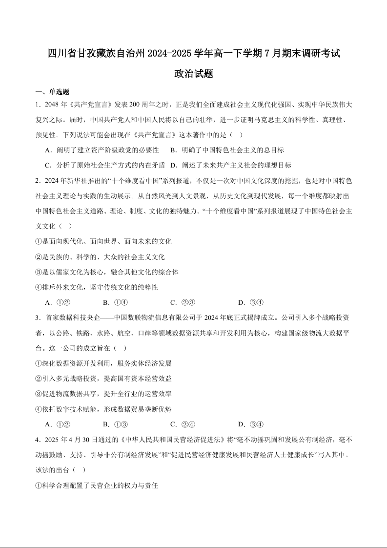 高一政治+答案--四川省甘孜藏族自治州2024-2025学年高一下学期7月期末全州统一调研考试