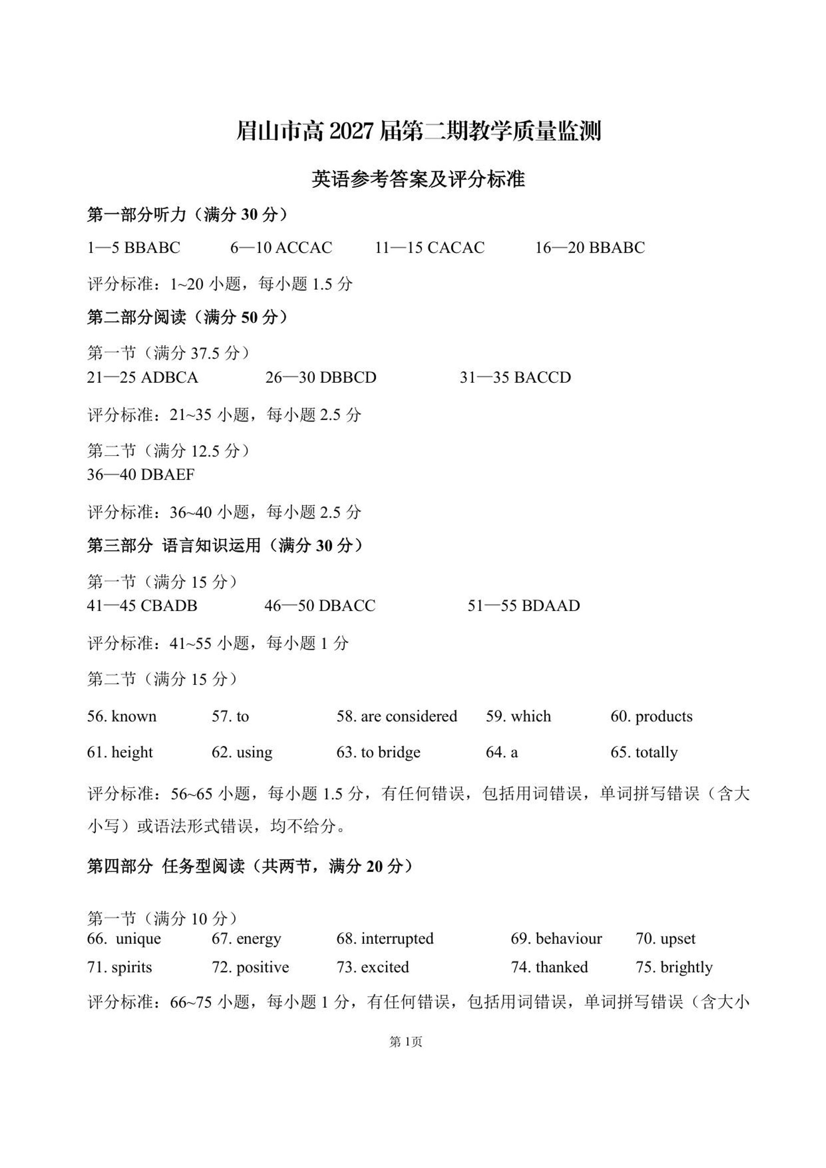 高一英语答案--四川省眉山市2024-2025学年高一第二学期期末教学质量检测