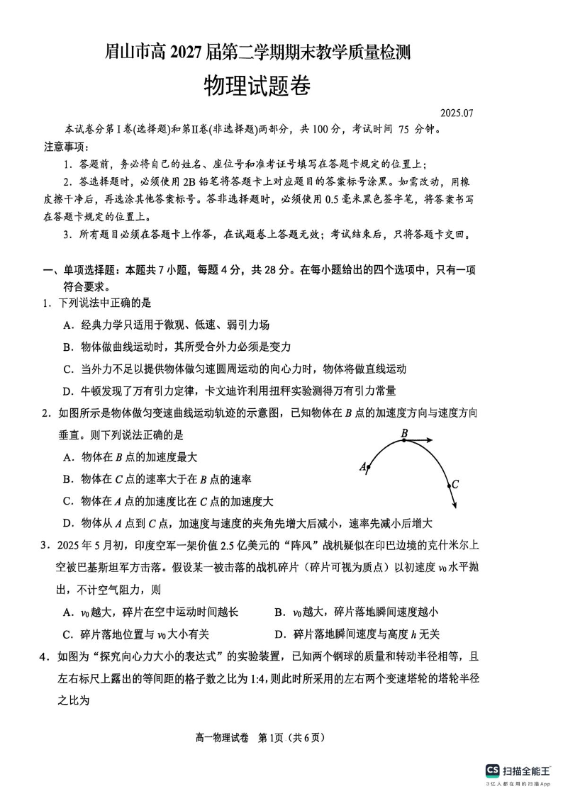 高一物理+答案--四川省眉山市2024-2025学年高一第二学期期末教学质量检测