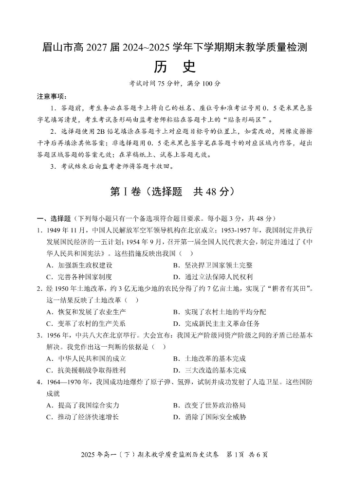 高一历史--四川省眉山市2024-2025学年高一第二学期期末教学质量检测