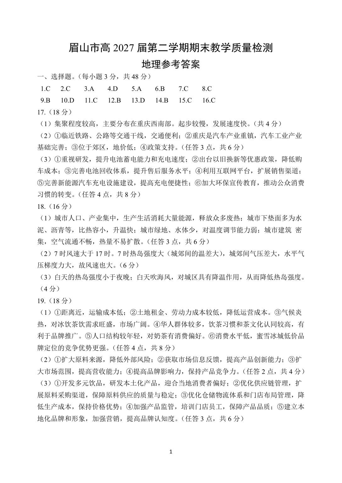 高一地理答案--四川省眉山市2024-2025学年高一第二学期期末教学质量检测