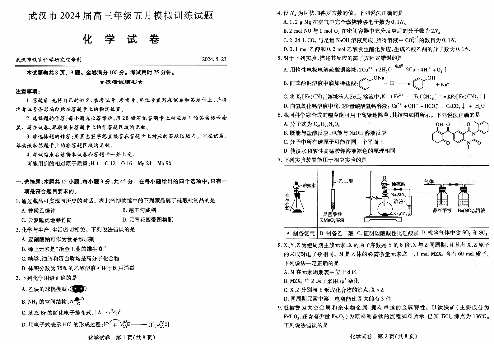 湖北省武汉市2024届高三下学期五月模拟训练化学