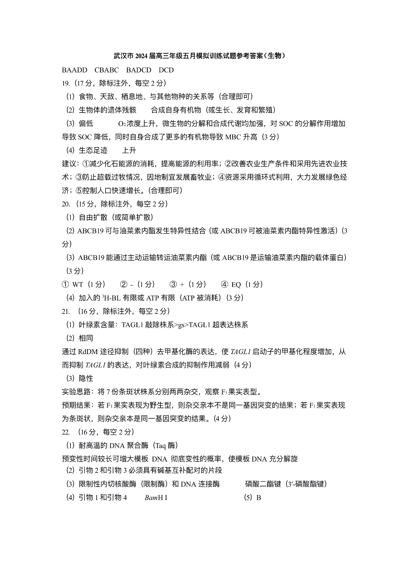 湖北省武汉市2024届高三下学期五月模拟训练生物答案