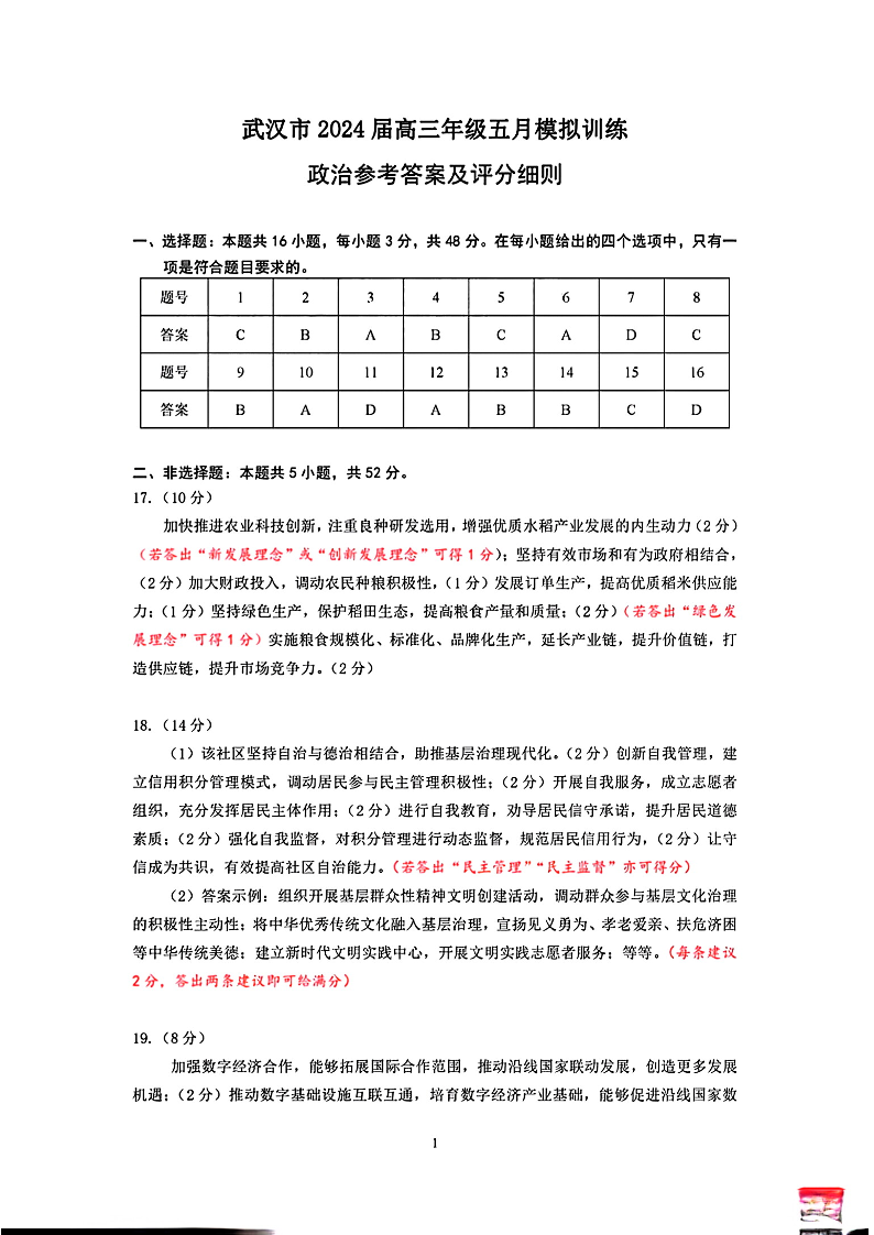 湖北省武汉市2024届高三下学期五月模拟训练政治答案
