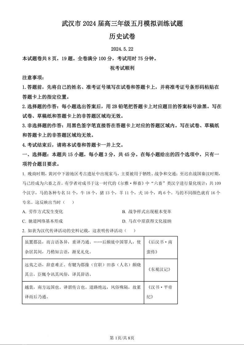 湖北省武汉市2024届高三下学期五月模拟训练历史(原卷版)