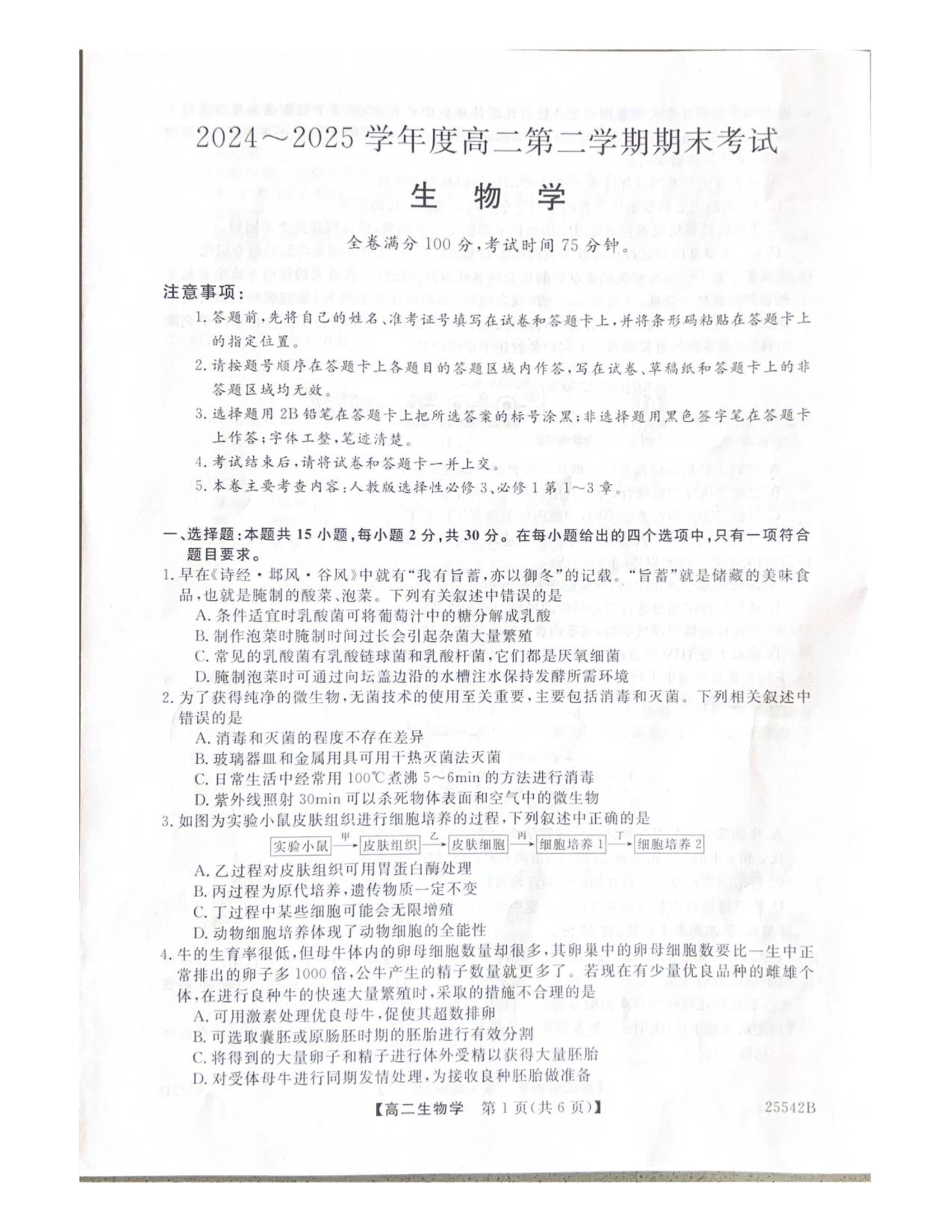 高二生物--吉林省白山市五校2024-2025学年高二下学期期末联考