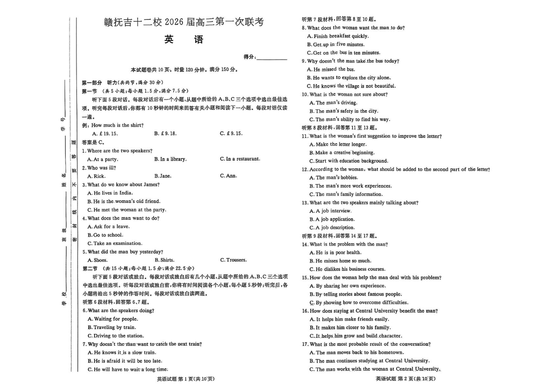 高二英语+答案--江西省赣抚吉十二校2026届高三上学期第一次联考
