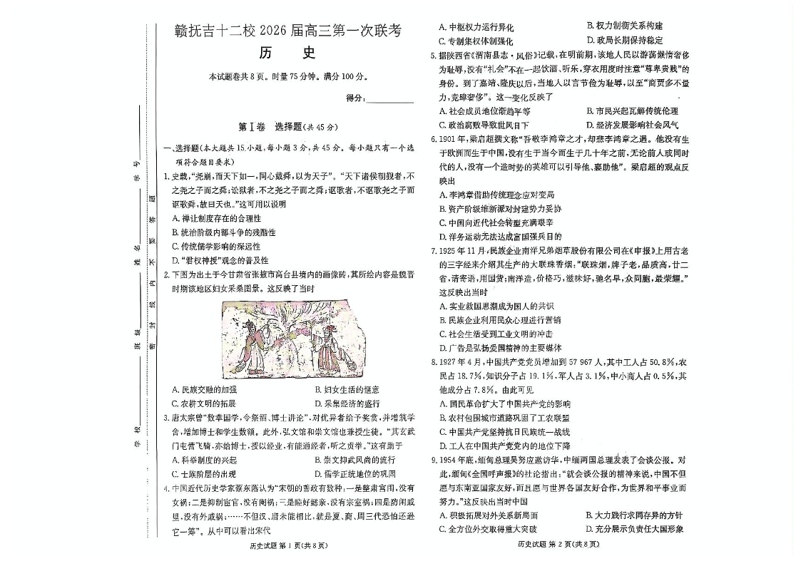 高二历史+答案--江西省赣抚吉十二校2026届高三上学期第一次联考