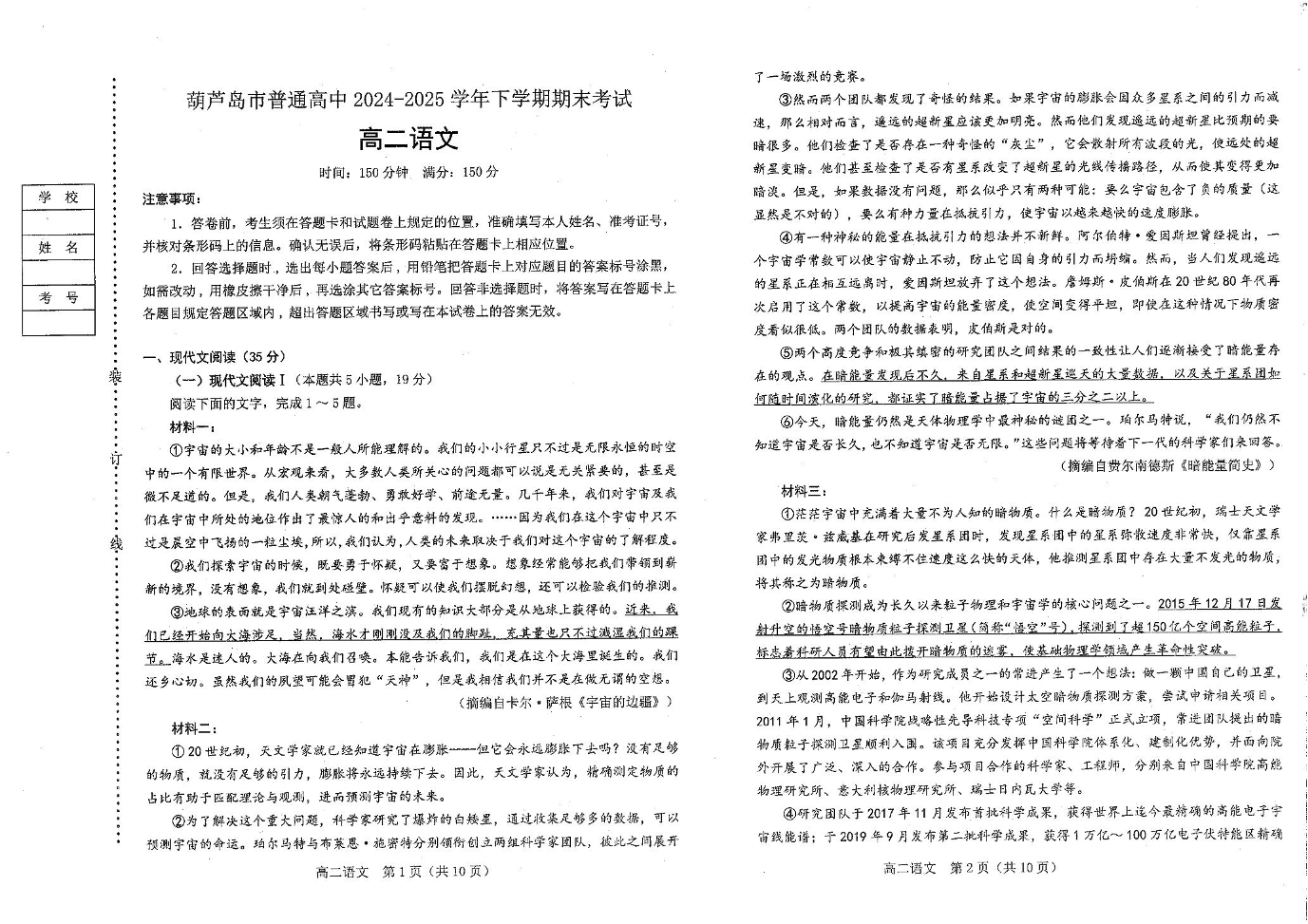 高二语文--辽宁省葫芦岛市普通高中2024-2025学年高二下学期期末考试