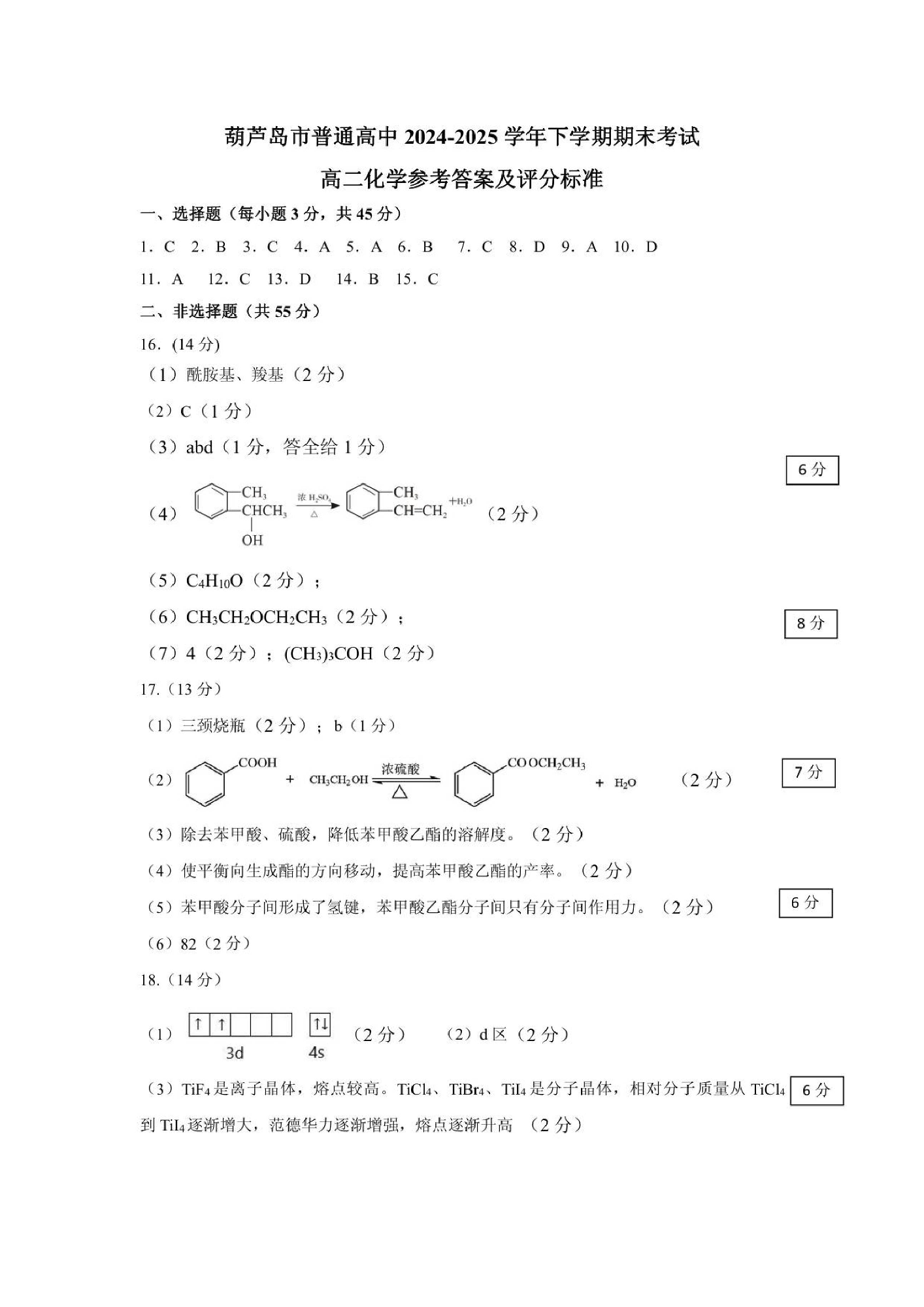 高二化学答案--辽宁省葫芦岛市普通高中2024-2025学年高二下学期期末考试