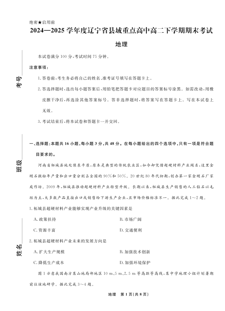 高二地理+答案--辽宁省县域重点高中2024-2025学年高二下学期期末