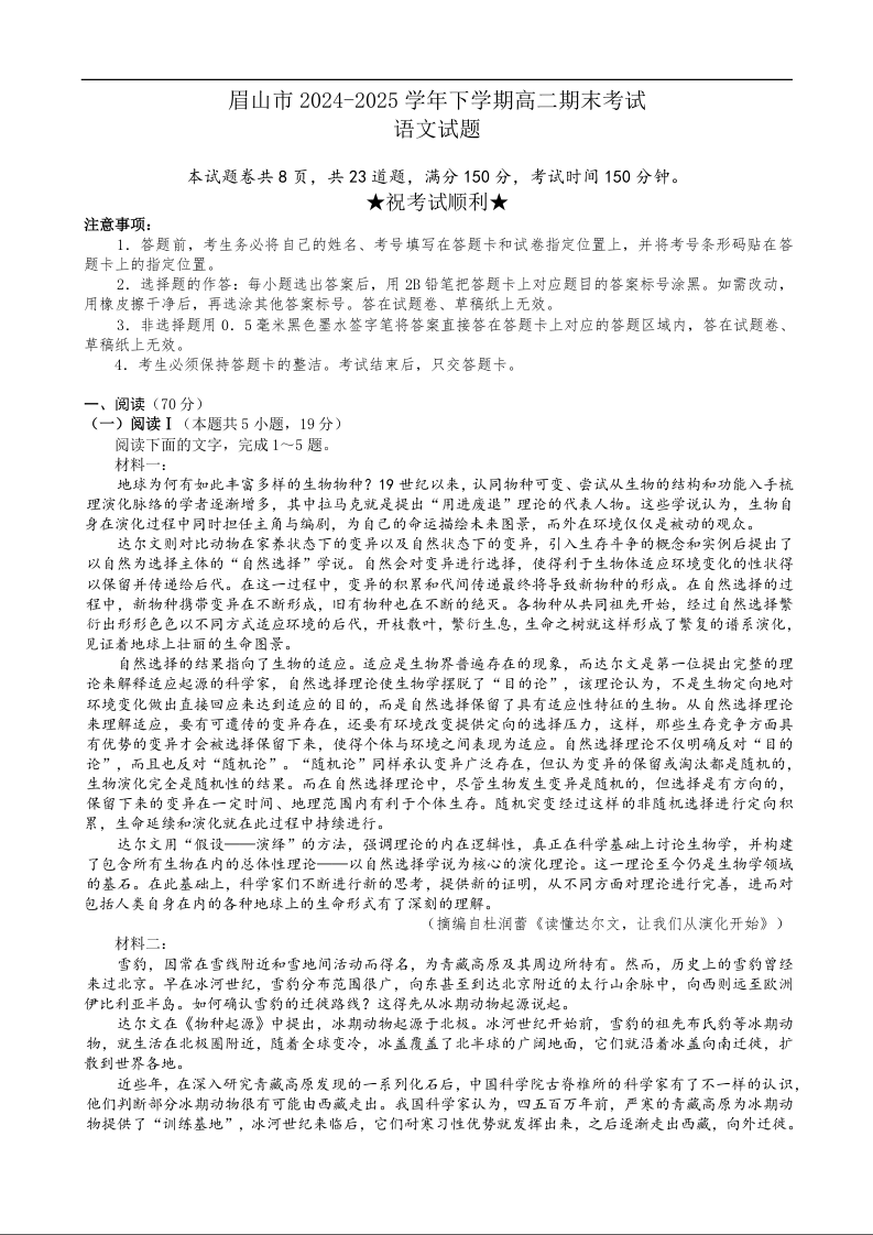 高二语文+答案--四川省眉山市高2026届第四学期期末教学质量检测