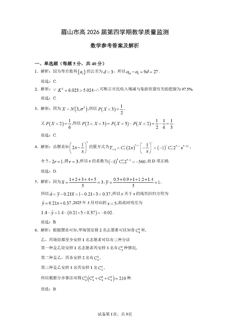 高二数学答案--四川省眉山市高2026届第四学期期末教学质量检测