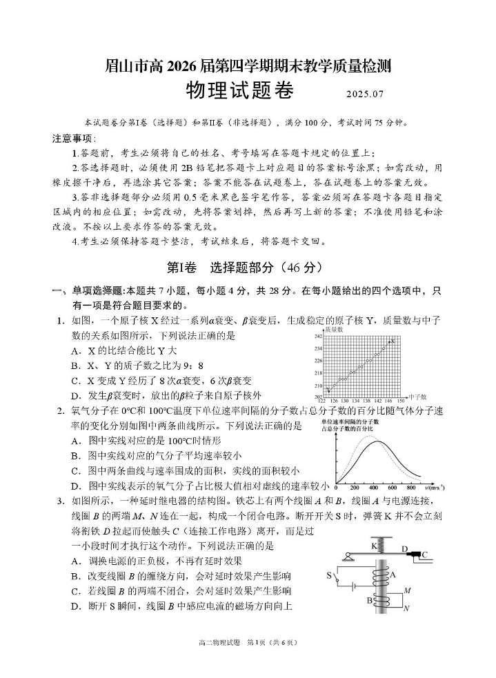 高二物理+答案--四川省眉山市高2026届第四学期期末教学质量检测