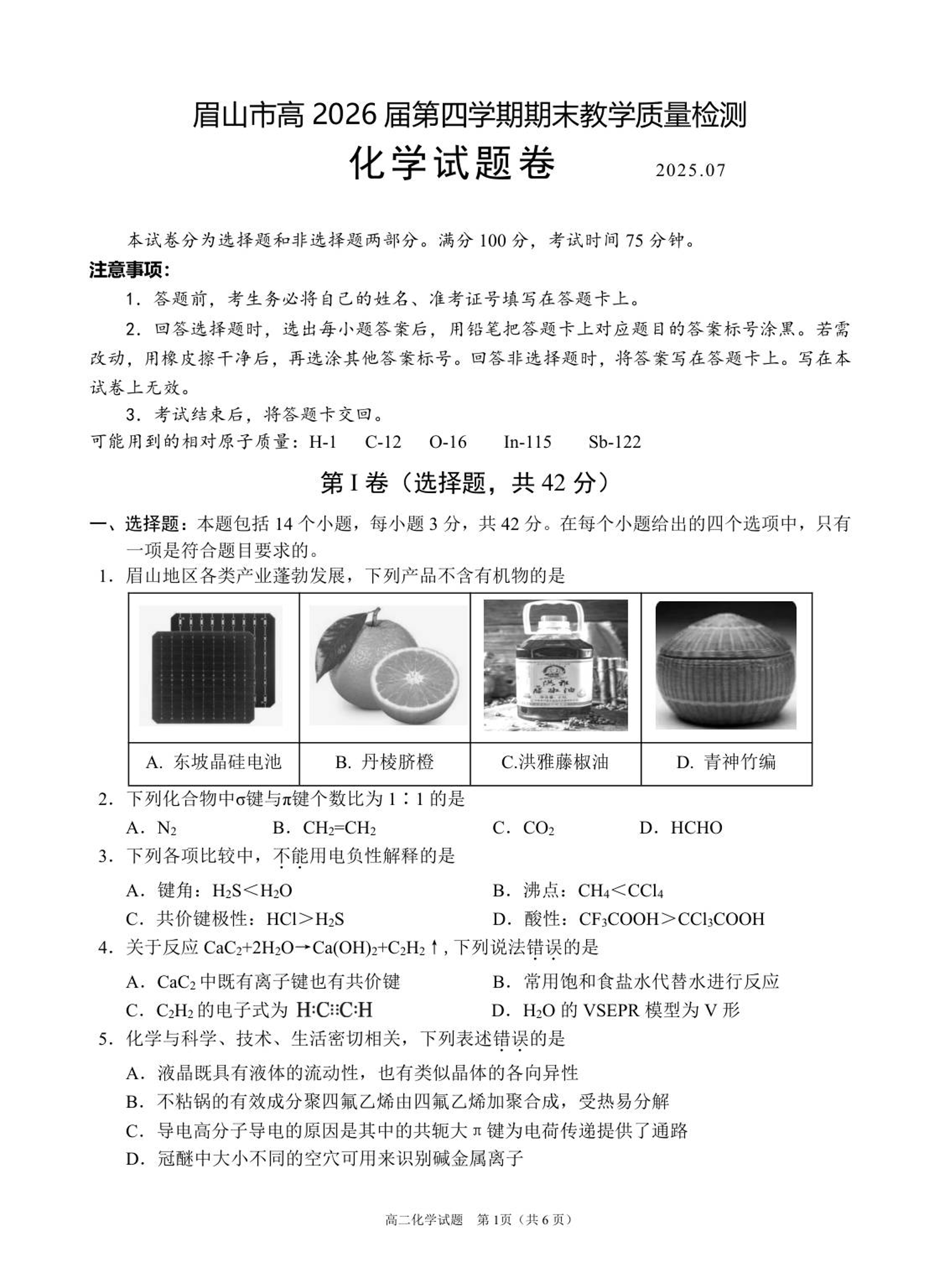 高二化学--四川省眉山市高2026届第四学期期末教学质量检测